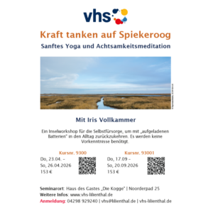 Sanftes Yoga und Achtsamkeitsmeditation mit Iris Vollkammer Ein Inselworkshop für die Selbstfürsorge, um mit „aufgeladenenBatterien“ in den Alltag zurückzukehren. Es werden keineVorkenntnisse benötigt. Kurs Nr.